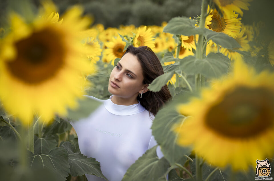 walking on a sunflowers field in a white Amoresy Catsuit.
